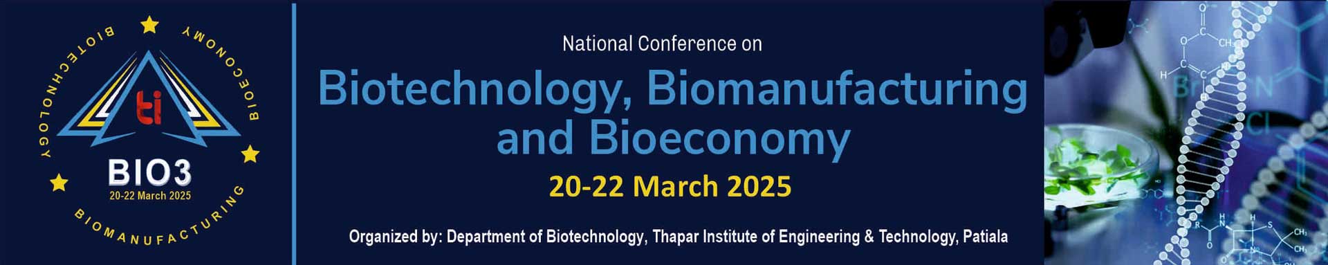The Department of Biotechnology, Thapar Institute of Engineering and Technology, Patiala, proudly announces BIO3: Biotechnology, Biomanufacturing, and Bioeconomy, a pioneering conference scheduled to take place from March 20 to 22, 2025. This three-day event is dedicated to fostering innovation, collaboration, and excellence in the realm of biotechnology and its transformative potential in shaping a sustainable future. Aligned with the visionary theme developed under the leadership of Dr. Rajesh S. Gokhale, Secretary, Department of Biotechnology & DG, BRIC, BioE3: Biotechnology for Empowerment, Entrepreneurship, and Economy, and reflecting the national mission of Viksit Bharat, BIO3 aims to catalyze discussions on leveraging biotechnology as a critical driver for self-reliance, economic growth, and global leadership.